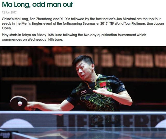 近日,国际乒联撰文对即将开始的2017年日本公开赛进行预热。男单由于张继科缺阵,世界排名第六的东道主一哥水谷隼成为男单第四号种子。乒联表示世界第一马龙目前已经拿到了23个乒联公开赛男单冠军,比萨姆索诺夫的26个少三个。但令人意外的是,大满贯球员马龙迄今还没能在日本公开赛上获得男单冠军。