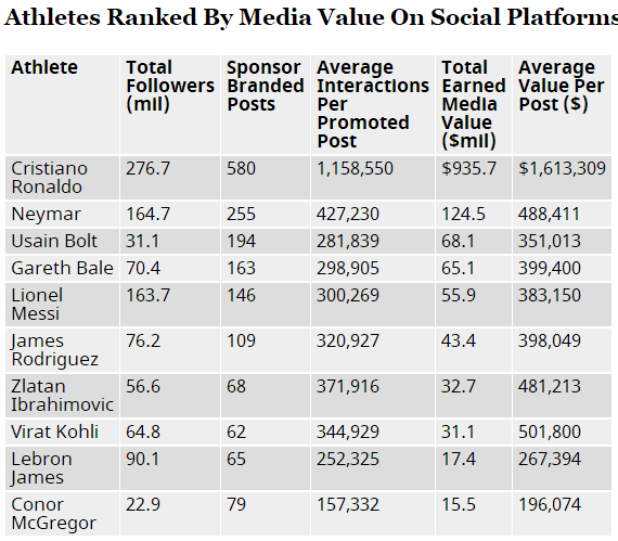 Hookit统计了世界上最有影响力的100名运动员的互联网平台吸金能力,前7中只有博尔特不是足球运动员,前10分别是C罗、内马尔、博尔特、贝尔、梅西、J罗、伊布、科利(板球)、勒布朗-詹姆斯和康纳-麦格雷戈(格斗),排序则根据他们的粉丝数量、赞助商帖子、每个帖子网友参与互动次数、总商业价值和平均每个帖子商业价值,我们不难发现,C罗所有数据都遥遥领先内马尔。