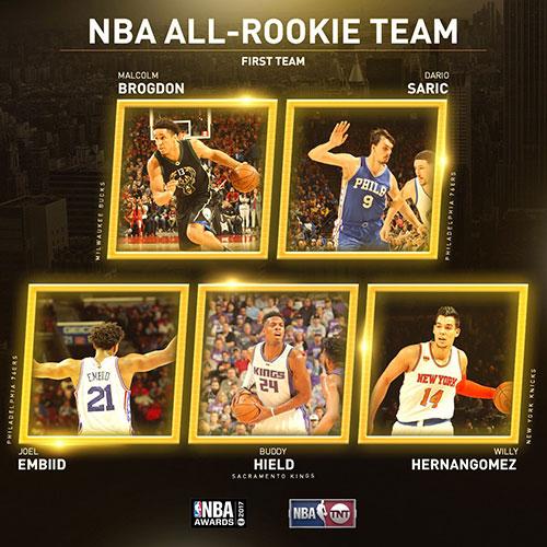 NBA官方今天公布了2016-17赛季最佳新秀阵容名单,雄鹿后卫布罗格顿和76人前锋萨里奇全票入选,恩比德排名第三。