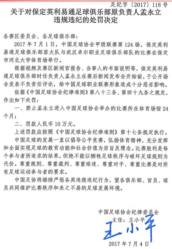 对原容大俱乐部负责人孟永立的处罚决定:禁足2年,罚款10万。