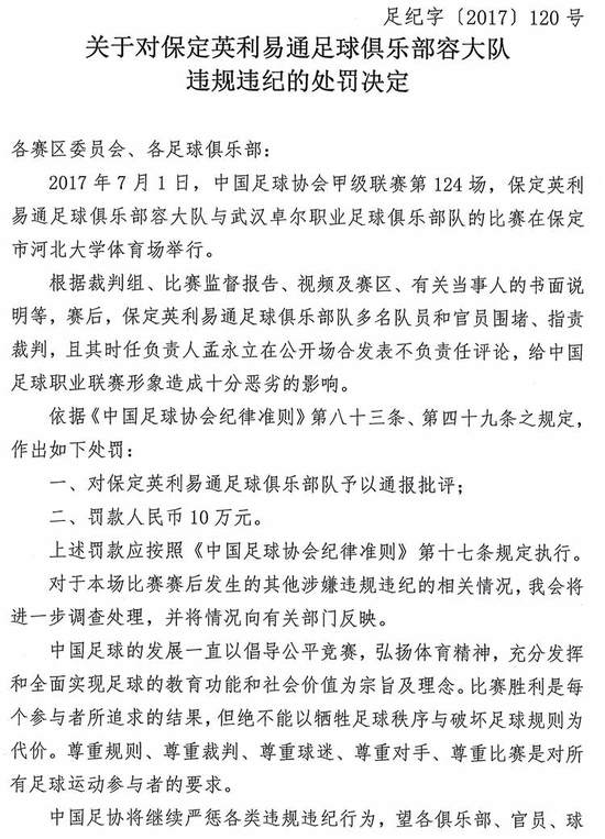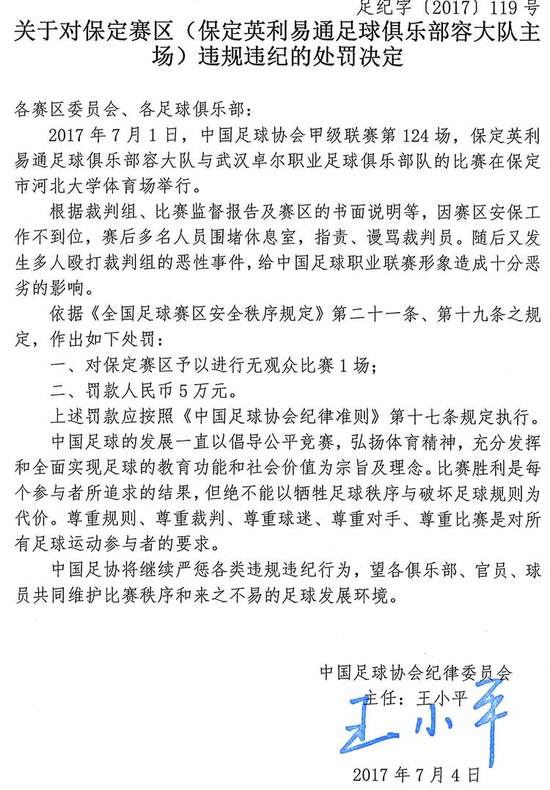 7月5日,足协官方发布了对保定容大俱乐部的一系列处罚。