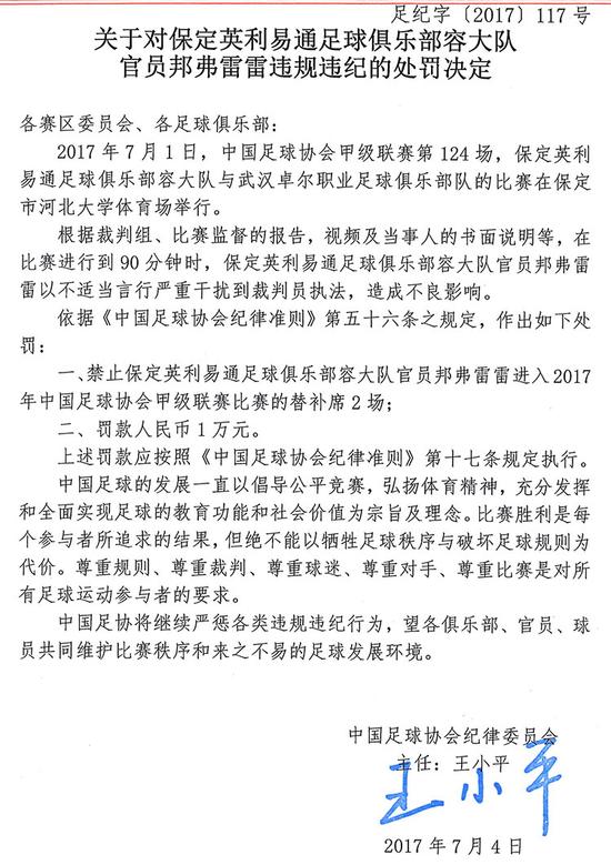 对容大主帅邦弗雷雷的处罚决定:停赛2场,罚款1万。