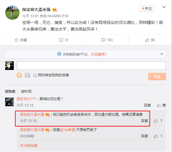 当球迷在留言中追问争议主裁黄翔的处罚结果时,孟永强的回答耐人寻味,“我只能找机会偷偷告诉你,因为是内部处理。结果还算满意。”还有球迷在底下表示,对前老总孟永立禁赛24个月的结果无法接受,“禁止入场24个月???不能忍!!!”孟永强则留言表示,“能忍。”