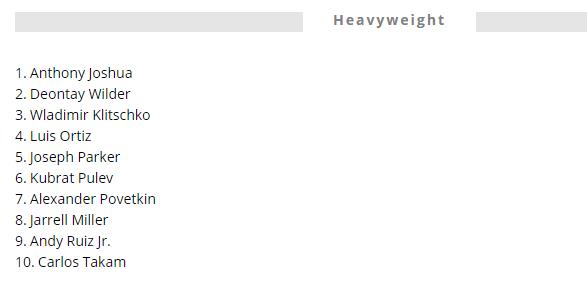 在体重最开放的重量级里,约书亚、维尔德、小克里琴科分列三甲,WBO现役冠军帕克位列第五,米勒凭借上周的大胜跻身第八。