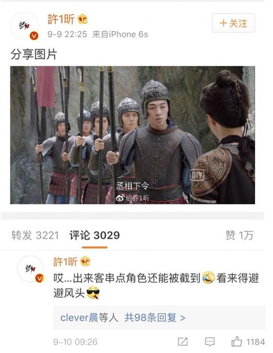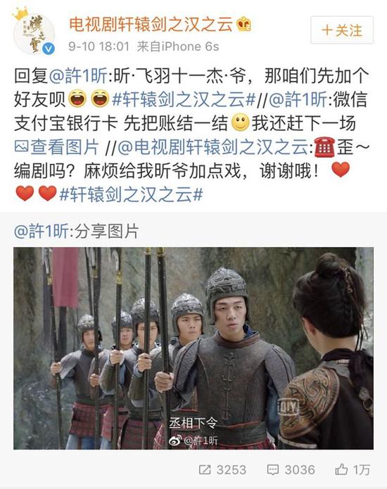 据了解,许昕晒出的视频截图系近日正在东方卫视热播的《轩辕剑之汉之云》的剧情片段。他也并未参演此剧拍摄,而是撞脸《轩辕剑之汉之云》剧组演员,而此番互动,除了令不少粉丝调侃许昕“乃戏精本精”,还被《轩辕剑之汉之云》的幽默回应圈粉,大呼“就喜欢你这种说实话的官博君”。