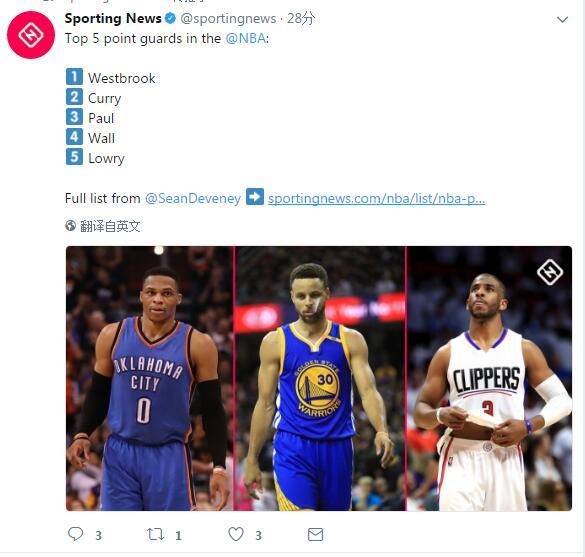 距离NBA新赛季开幕还有不到一个月的时间,体育网站Sporting News选出了下赛季最具实力的15名控卫,上赛季获得“场均三双”数据的俄克拉荷马城雷霆后卫拉塞尔-威斯布鲁克排在第一,金州勇士队后卫斯蒂芬-库里排在第二,休赛期转投休斯顿火箭队的克里斯-保罗排在第三。