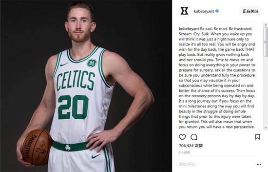 在新赛季揭幕战上,海沃德遭遇恐怖伤病,脚踝90度弯曲,被诊断为脚踝和胫骨骨折。海沃德重伤之后,收到了很多球员的祈祷和祝福。前湖人巨星科比也在个人社交网站上寄语海沃德,并提供了极具价值的建议。
