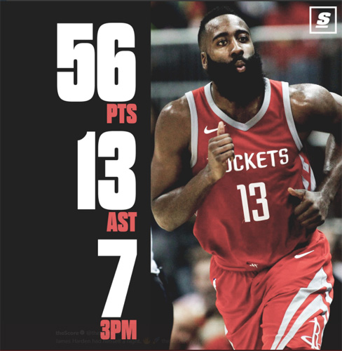 哈登三节爆砍52分 手下留情未挑战科比81分纪录
