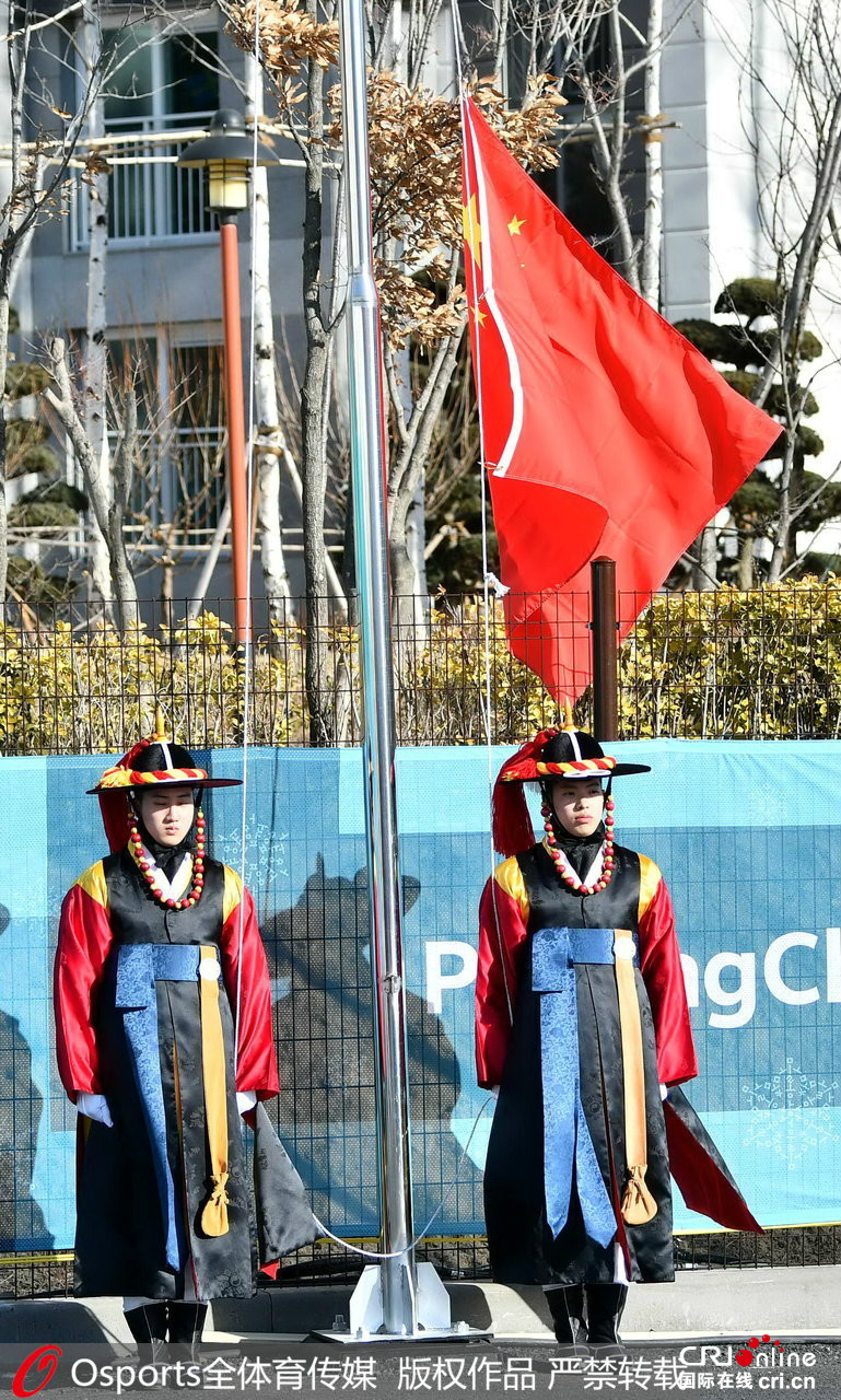 中国代表团于7日在江陵运动员村举行升旗仪式,现场观看韩国民族舞蹈表演,国家体育总局局长苟仲文与奥运村村长交换礼物。