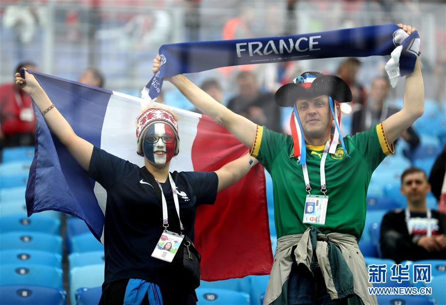 7月10日,两名法国队球迷在比赛前造势。当日,在圣彼得堡进行的2018俄罗斯世界杯足球赛半决赛中,法国队对阵比利时队。 新华社记者费茂华摄