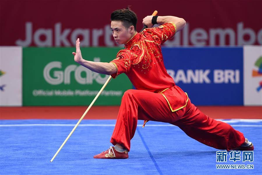 ↑8月21日,中国选手吴照华在棍术项目比赛中。 当日,在第18届亚运会武术男子刀术棍术全能比赛中,中国选手吴照华获得冠军。 新华社记者张金加摄