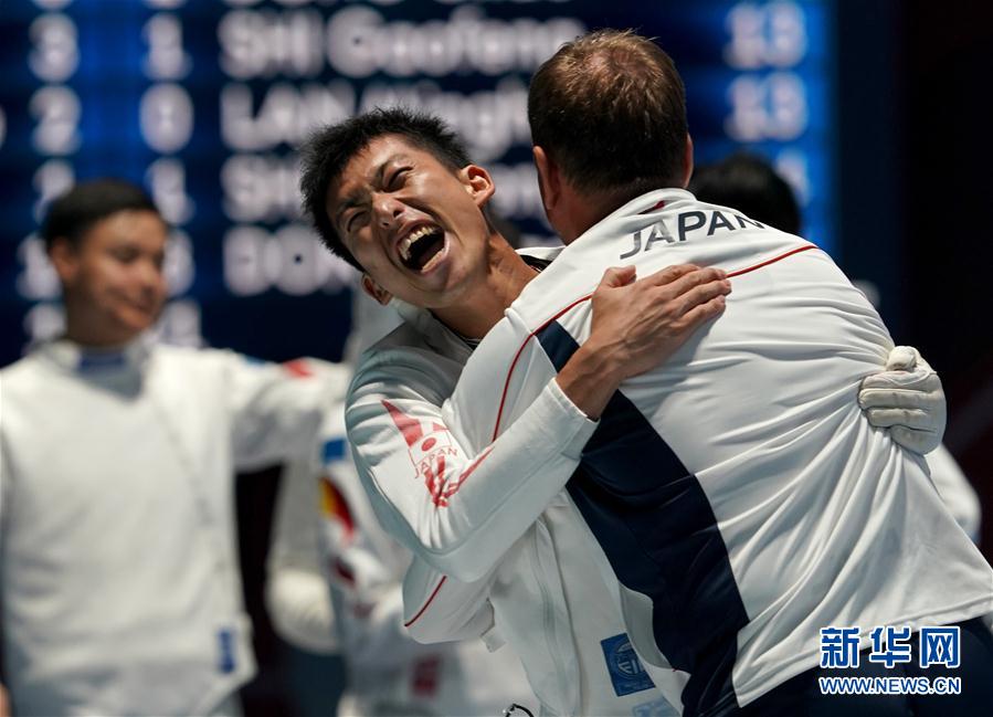 8月22日,日本队选手在获胜后庆祝。 当日,在印度尼西亚雅加达举行的第18届亚运会男子重剑团体决赛中,日本队夺冠,中国队亚军。 新华社记者王毓国摄