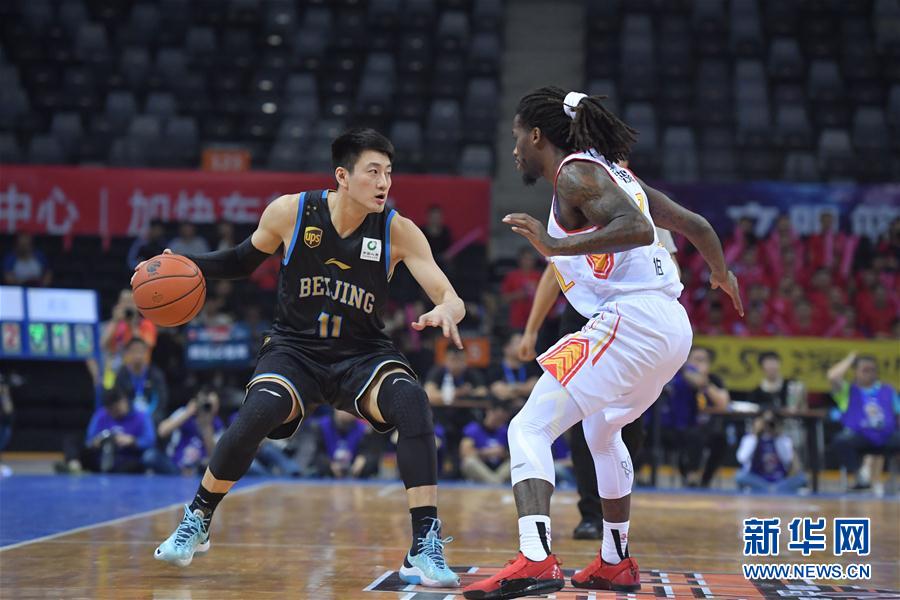 3月27日,北京首钢队球员段江鹏(左)在比赛中突破。 当日,在2018-2019赛季中国男子篮球职业联赛(CBA)季后赛四分之一决赛第二回合比赛中,深圳马可波罗队主场以88比104不敌北京首钢队。 新华社发(储焱摄)