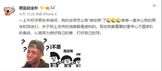 日前网上盛传,男篮国手胡金秋已经与浙江广厦队续约,金额为5年1000万元,平均年薪仅为200万元。胡金秋“白菜价”续约的消息,引发外界的激烈争论。对此胡金秋本人通过社交媒体进行了澄清,表示一切都是子虚乌有。“一上午好多朋友来询问,我的合同怎么就‘被安排’了,谢谢一直关心我的朋友和球迷们,关于网上流传的消息都是虚构的。”胡金秋写道,同时他还上传了一张“黑人问号脸”,表示对此事并不知情。
