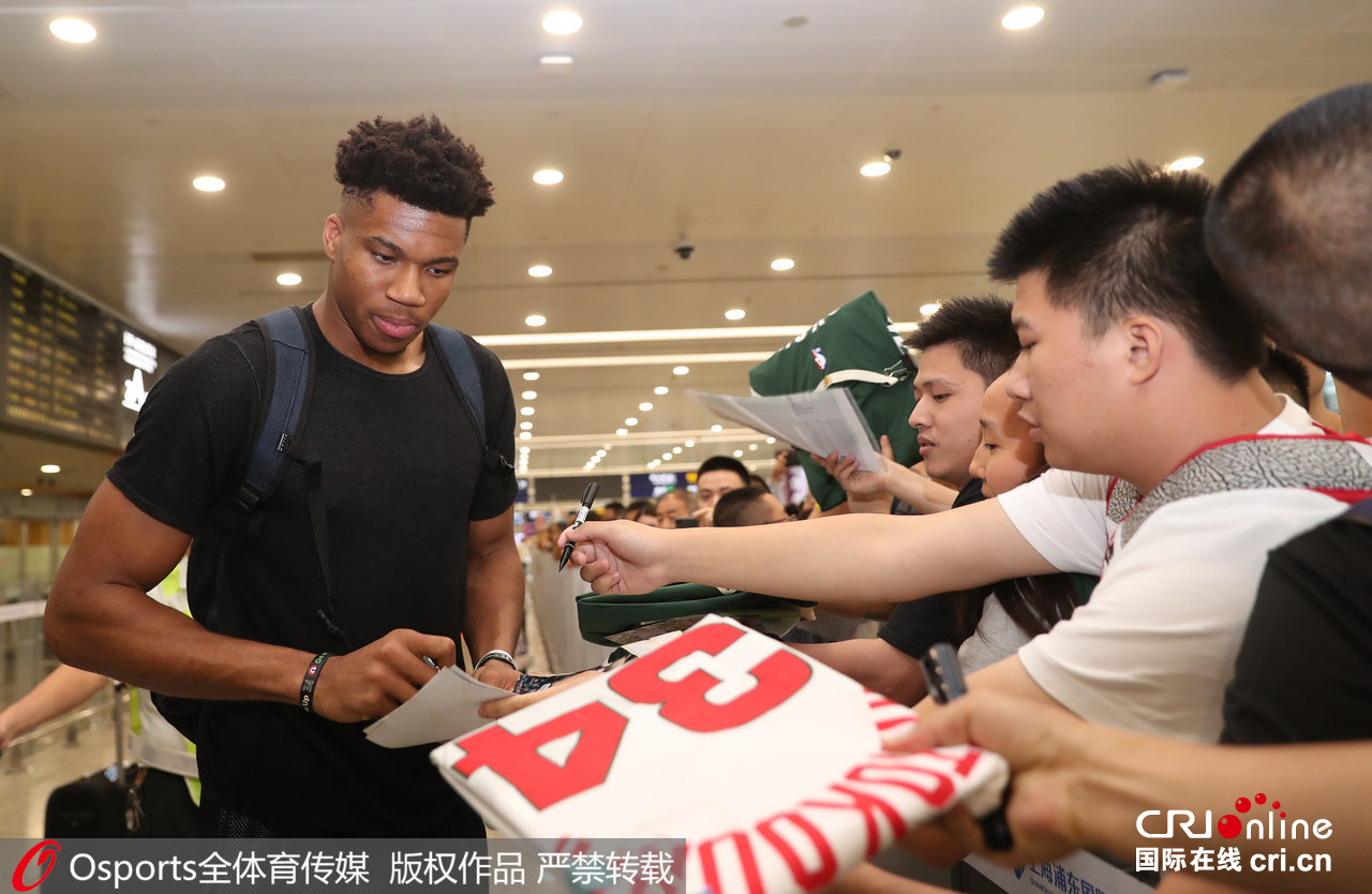 希腊男篮抵达上海浦东国际机场,即将征战在中国举办的男篮世界杯,“字母哥”阿德托昆博成为最大焦点,被大批球迷索要签名合照。