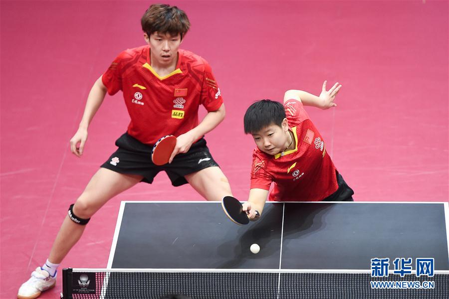 3月5日,王楚钦/孙颖莎(右)在比赛中。 当日,在多哈举行的2020年国际乒联世界巡回赛卡塔尔公开赛混双首轮的比赛中,中国选手王楚钦/孙颖莎以3比0战胜中国香港选手黄镇廷/杜凯琹,晋级下一轮。 新华社发(尼库摄)