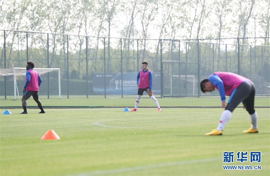 4月20日,上海绿地申花队球员沙拉维(中)在球场上训练。 当日,上海绿地申花队举行媒体开放日活动,球员目前在做好防控疫情工作的前提下处于正常训练状态。 新华社记者 丁汀 摄