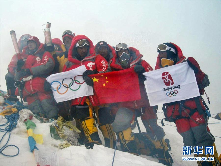 1960年5月25日,中国登山运动员王富洲、贡布、屈银华三人首次从北坡登上珠穆朗玛峰,创造了人类历史上第一次从北坡登上世界第一高峰的壮举。登山勇士们不畏险阻、一往无前的精神,鼓舞着一代代登山人向着珠穆朗玛峰前进。 这是2008年5月8日,北京奥运圣火珠峰传递登山队成功登顶珠峰,中国登山队员在峰顶展示中国国旗、奥运五环旗和北京奥运会会徽旗。 新华社发