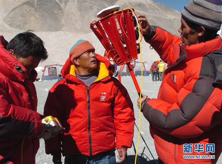 1960年5月25日,中国登山运动员王富洲、贡布、屈银华三人首次从北坡登上珠穆朗玛峰,创造了人类历史上第一次从北坡登上世界第一高峰的壮举。登山勇士们不畏险阻、一往无前的精神,鼓舞着一代代登山人向着珠穆朗玛峰前进。 这是2005年4月16日,国家测绘局大地测量处测绘专家在海拔5200米的珠峰大本营培训参加珠峰高程测量的8名高山协作人员,给他们讲解立觇标,GPS、气象、雷达等仪器的安装和测量方法。 新华社记者索朗罗布摄
