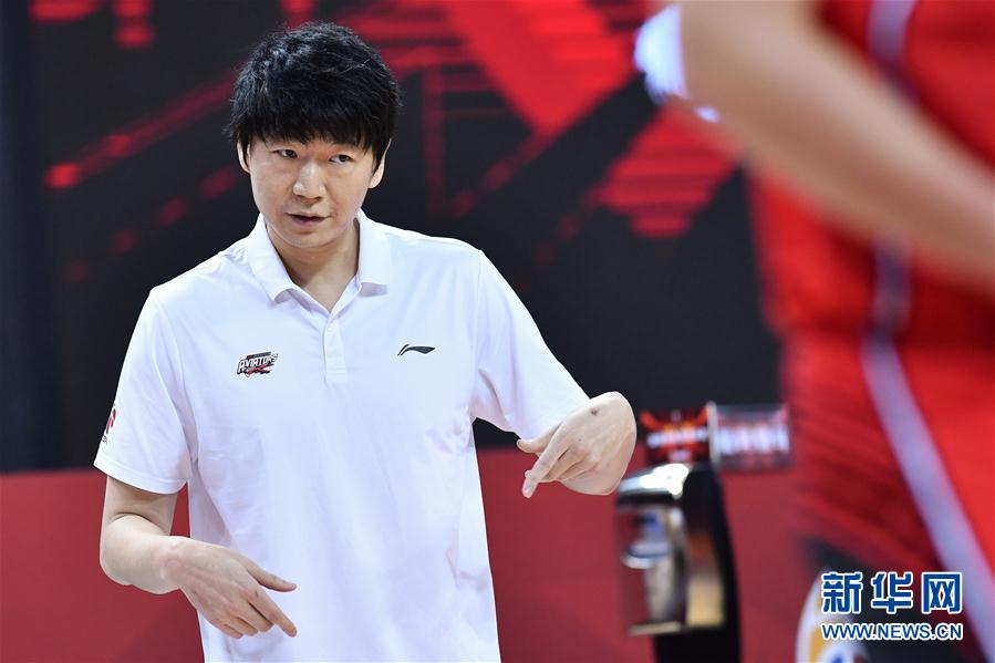 7月13日,深圳马可波罗队助理教练邱彪在比赛中指挥。 当日,在山东青岛举行的2019-2020赛季中国男子篮球职业联赛(CBA)复赛第二阶段(红岛赛区)比赛中,新疆伊力特队以122比86战胜深圳马可波罗队。 新华社记者 朱峥 摄
