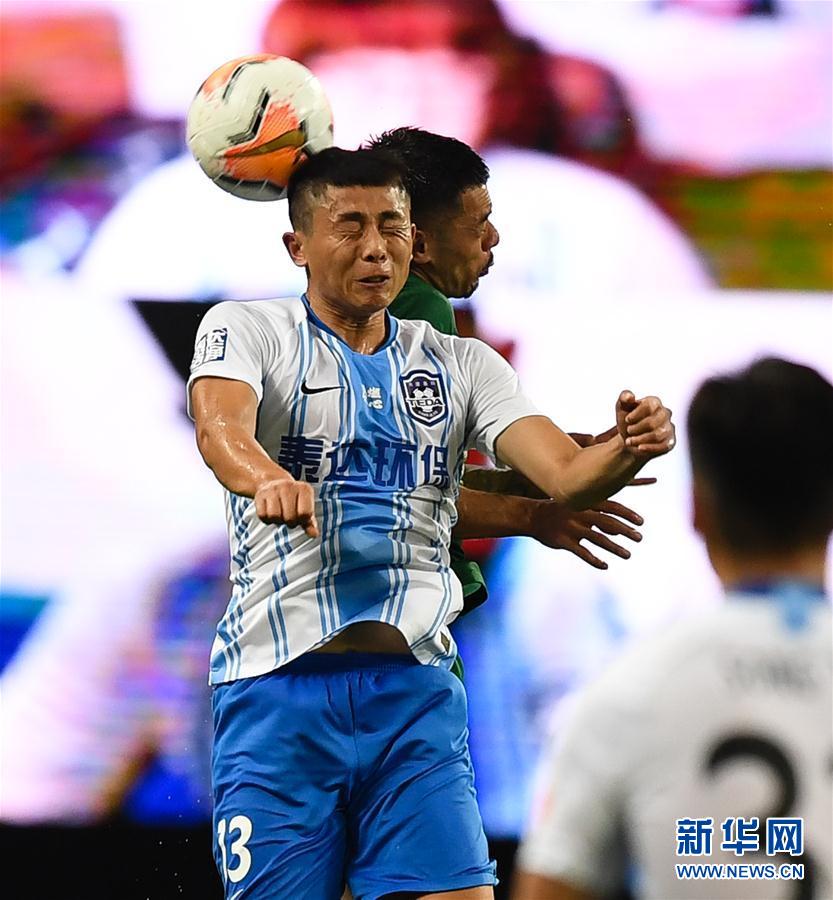 8月6日,天津泰达队球员郑凯木(前)在比赛中争顶头球。 当日,在2020赛季中国足球协会超级联赛第一阶段(苏州赛区)第三轮比赛中,北京中赫国安队以3比1战胜天津泰达队。 新华社记者 季春鹏 摄
