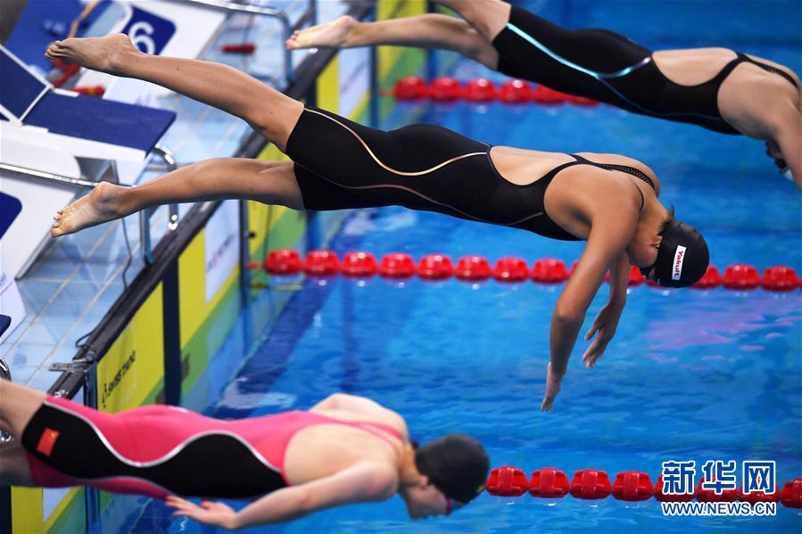 9月27日,王简嘉禾(中)在比赛中入水。 当日,在青岛举行的2020全国游泳冠军赛暨东京奥运会达标赛女子1500米自由泳预赛中,辽宁浩沙队选手王简嘉禾以15分45秒59的成绩获得第一名,并打破亚洲纪录。 新华社记者 李紫恒 摄