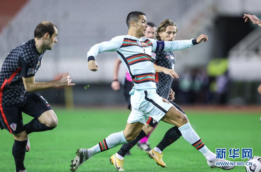 11月17日,葡萄牙队球员克·罗纳尔多(前右)在比赛中带球进攻。当日,在克罗地亚斯普利特进行的欧足联国家联赛A级第三组第六轮比赛中,葡萄牙队客场以3比2战胜克罗地亚队。新华社发(斯拉夫科·米卓尔摄)