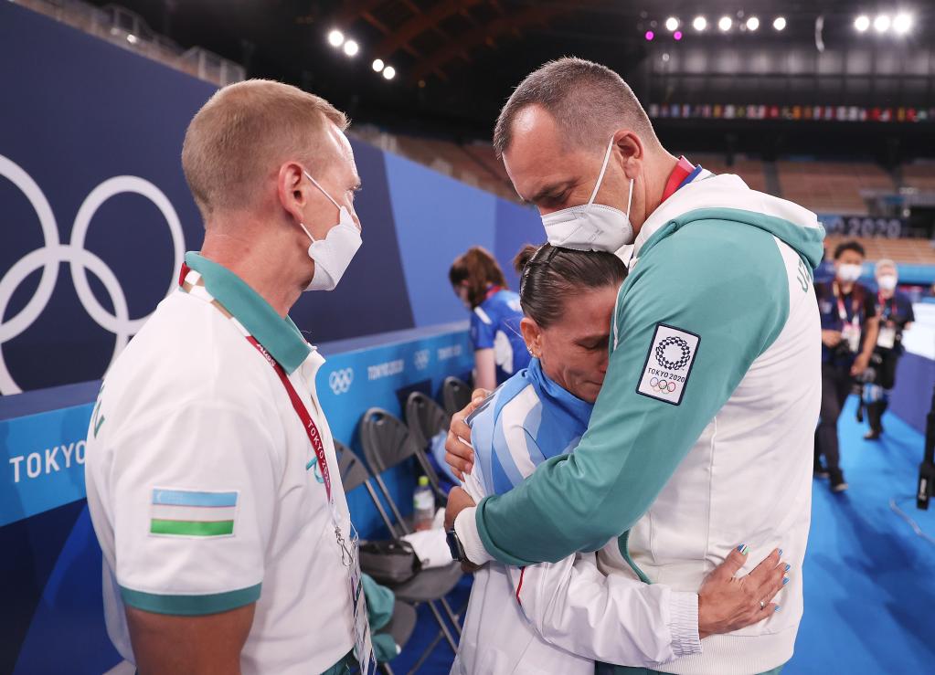 丘索维金娜转身走向教练,娇小的身躯埋在教练宽阔的臂弯里,坚强的她终究没有忍住奔涌而出的眼泪,此时的丘索维金娜更像个需要疼爱的孩子。