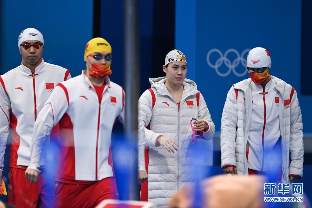 7月31日,中国队选手徐嘉余(左二)、闫子贝(左一)、张雨霏(右二)和杨浚瑄在比赛中出场。