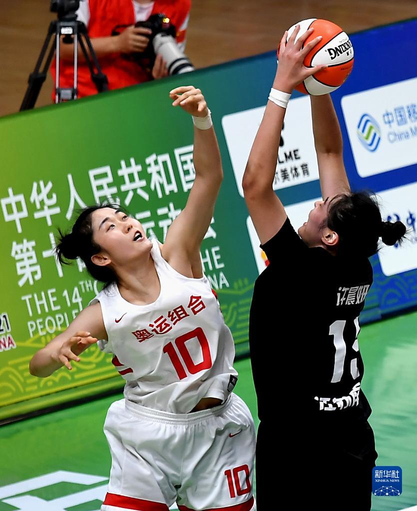 9月14日,江苏队球员许晨妍(右)和联合队球员潘臻琦在比赛中争抢篮板球。