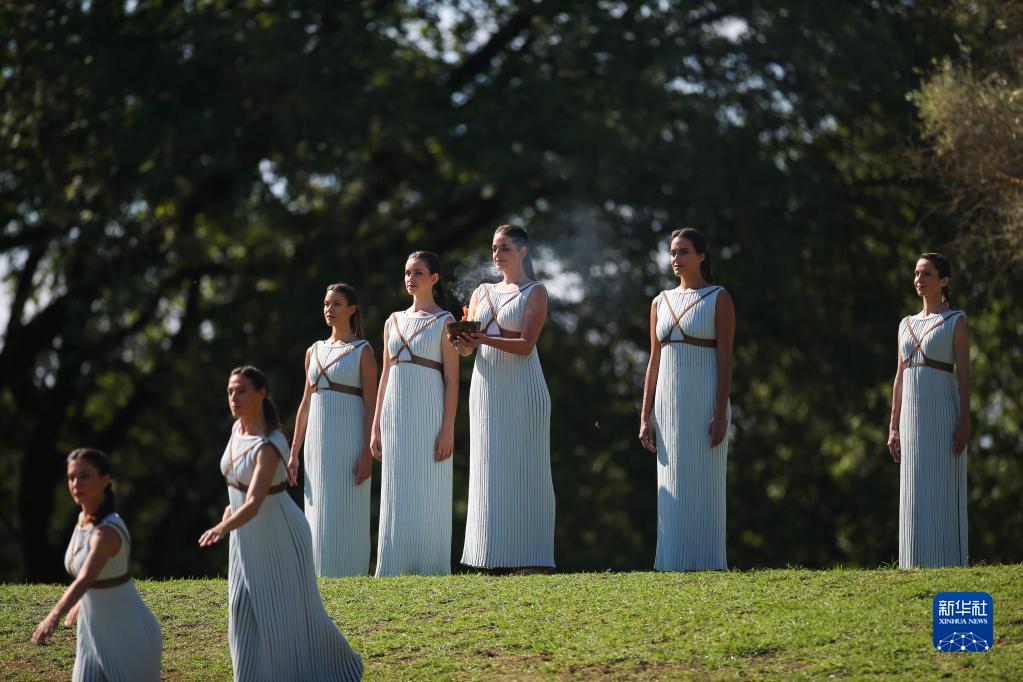 10月18日,扮演最高女祭司的演员乔治乌(右三)在火种采集仪式上手捧火种罐。