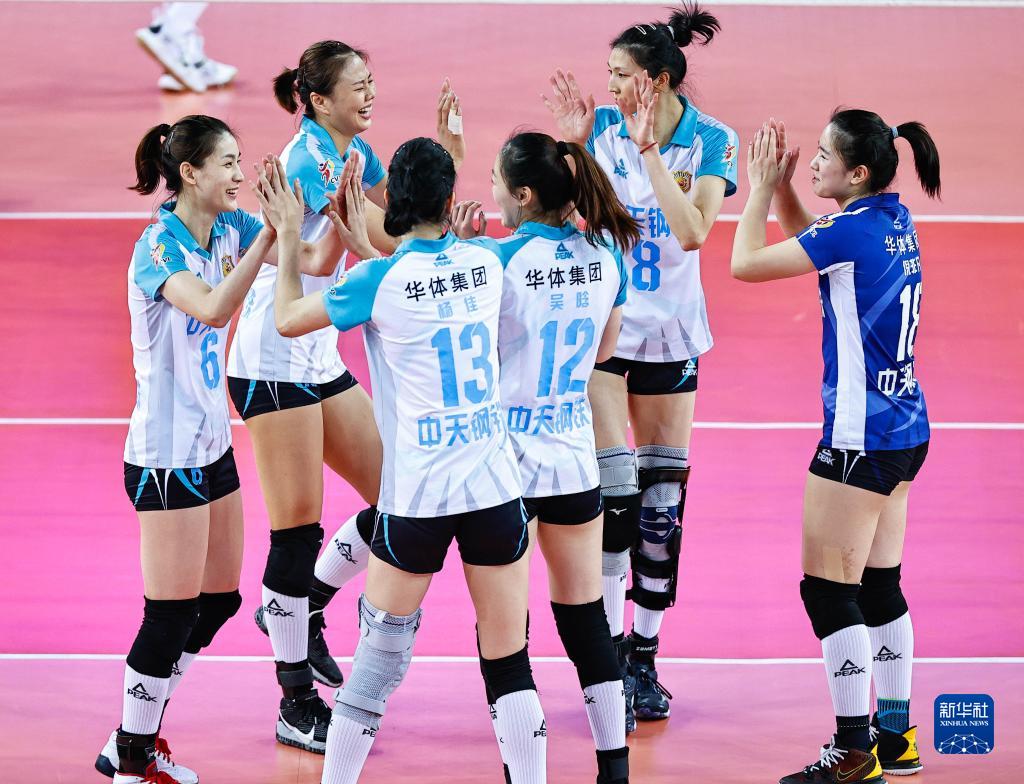 当日,在广东江门举行的2021-2022赛季中国女子排球超级联赛第三阶段半决赛第一场比赛中,江苏中天钢铁队以3比1战胜上海光明优倍队。