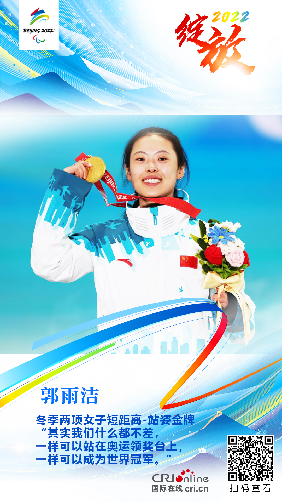 国际在线消息:在3月5日进行的北京冬残奥会冬季两项女子短距离-站姿比赛中,中国体育代表团开幕式旗手郭雨洁收获金牌。
