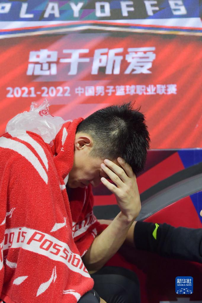 4月14日,广东东莞大益队球员周鹏因伤在场下休息。新华社记者 彭昭之 摄