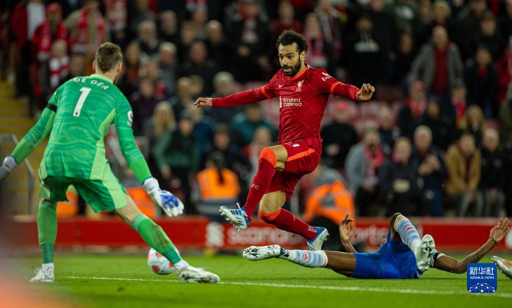 4月19日,利物浦队球员萨拉赫(右上)在比赛中。新华社发