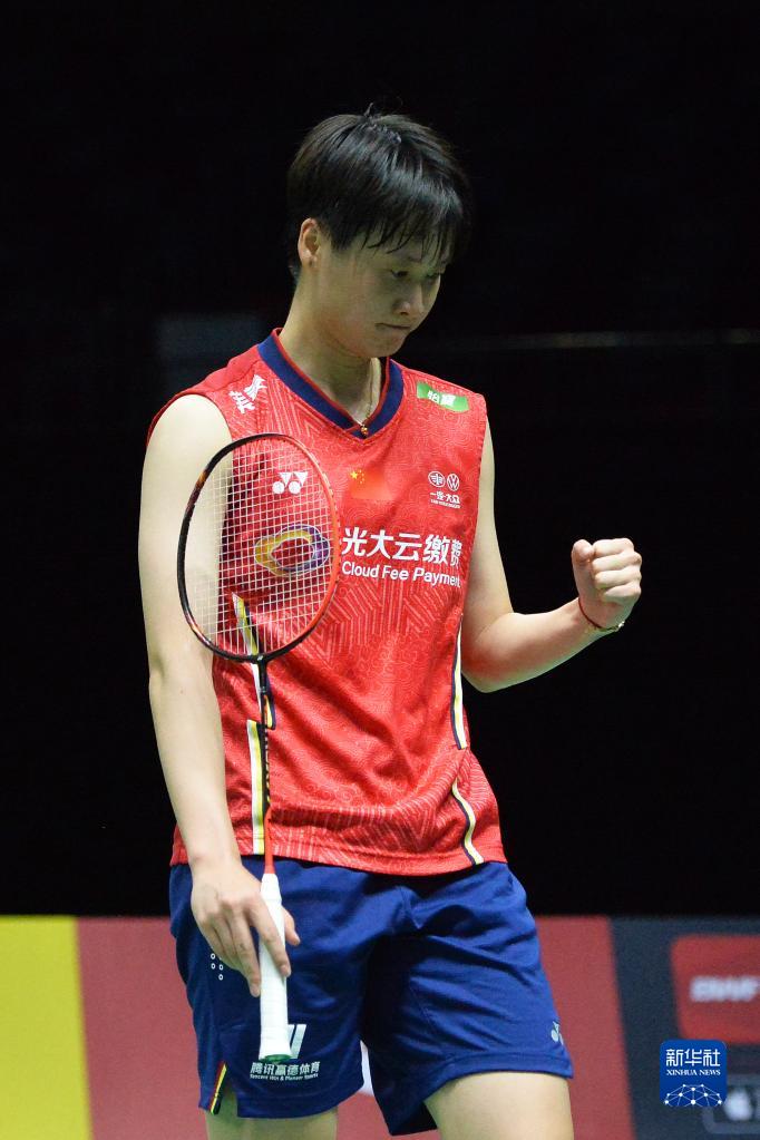 5月12日,中国队选手陈雨菲在比赛中庆祝得分。她在女单比赛中以2比0战胜印尼队选手戴维。新华社发(拉亨摄)