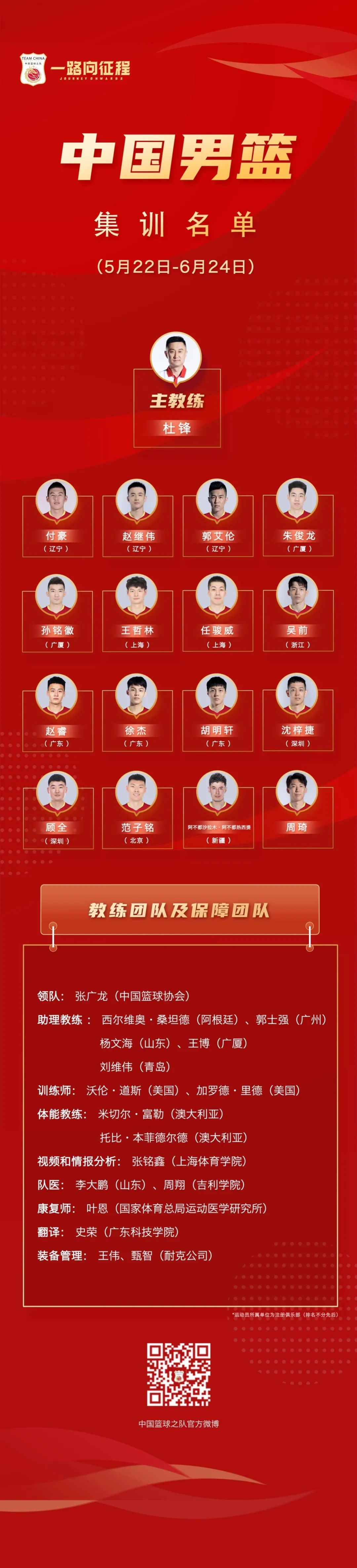 与此同时,中国篮球协会也公布了2022年中国男篮集训名单。为备战2023年男篮世界杯亚洲区预选赛第三个窗口期等赛事,中国男篮计划于2022年5月22日在广州长隆体育中心进行集训选拔。
