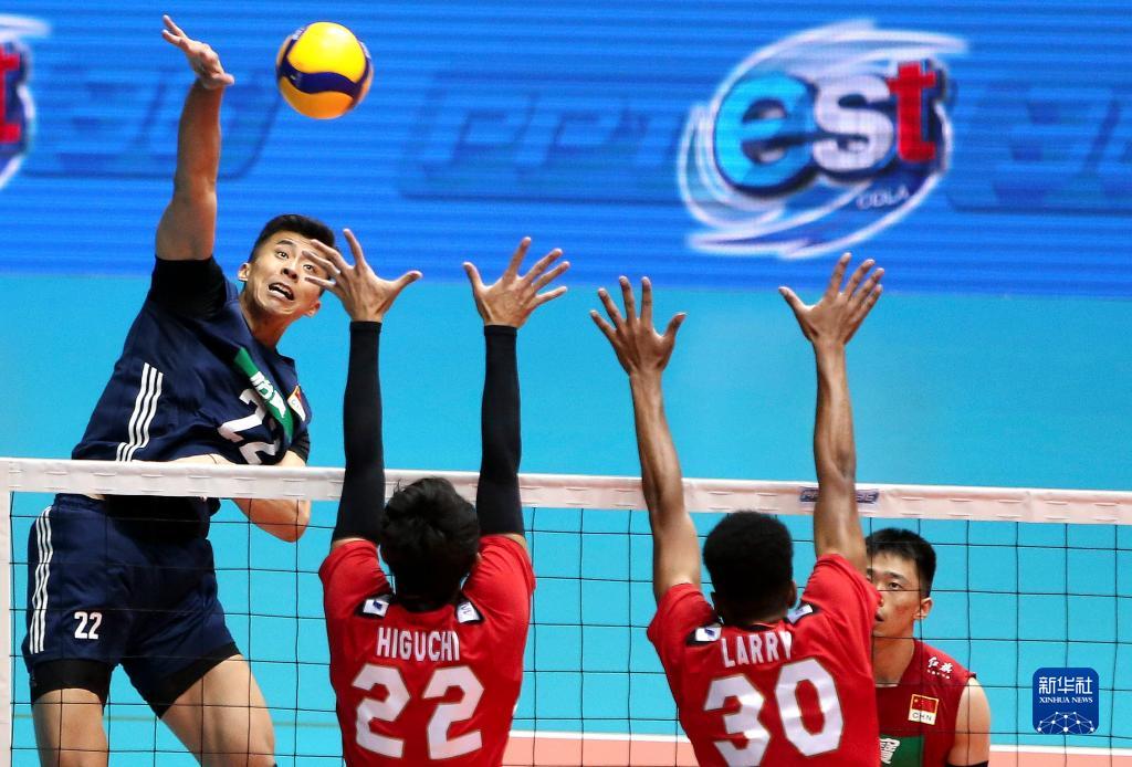 8月14日,中国队球员张景胤(左一)在比赛中扣球。新华社记者 王腾 摄