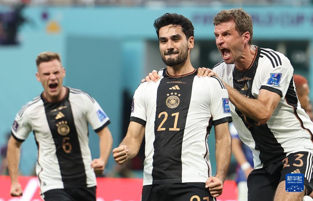11月23日,德国队球员伊尔凯·京多安(中)进球后庆祝。新华社记者 潘昱龙 摄