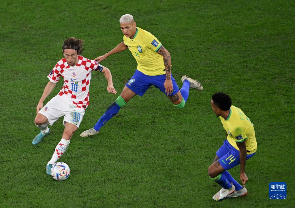 12月9日,克罗地亚队球员莫德里奇(左)与巴西队球员理查利森(中)、米利唐在比赛中拼抢。新华社记者 夏一方 摄