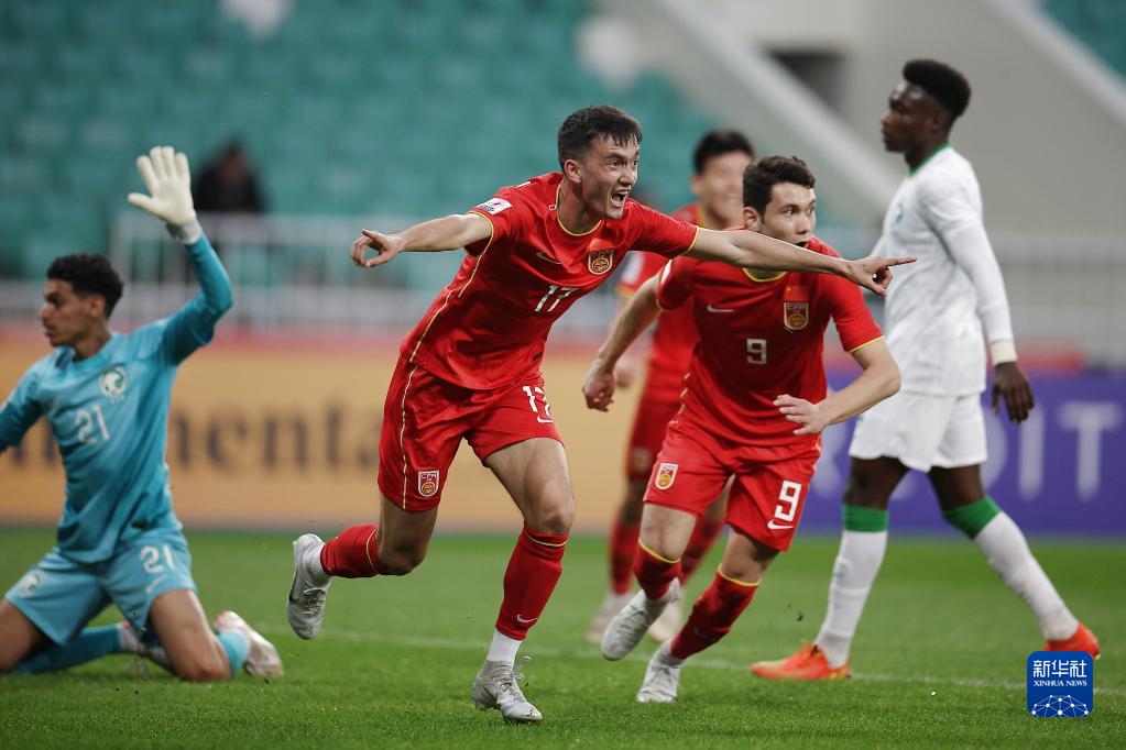 3月6日,中国队球员木塔力甫·依明卡日(中)在比赛中进球后庆祝。新华社发(车周勇摄)