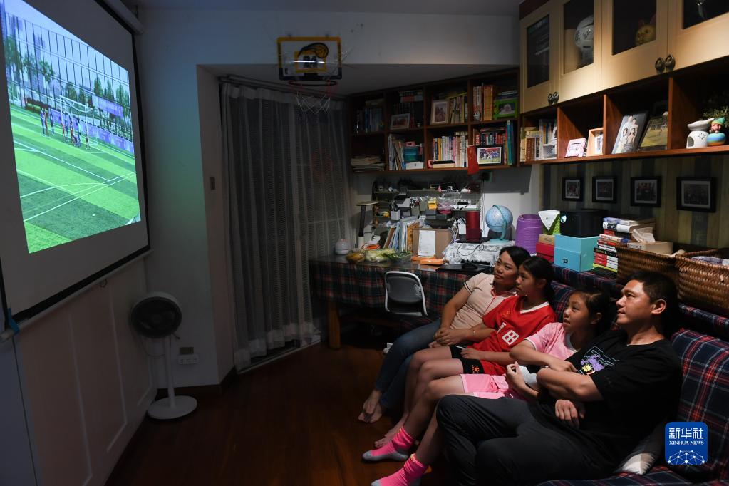 5月11日,练昱彤(右二)和爸爸妈妈以及妹妹在深圳的家中一起回看比赛视频。新华社记者 毛思倩 摄
