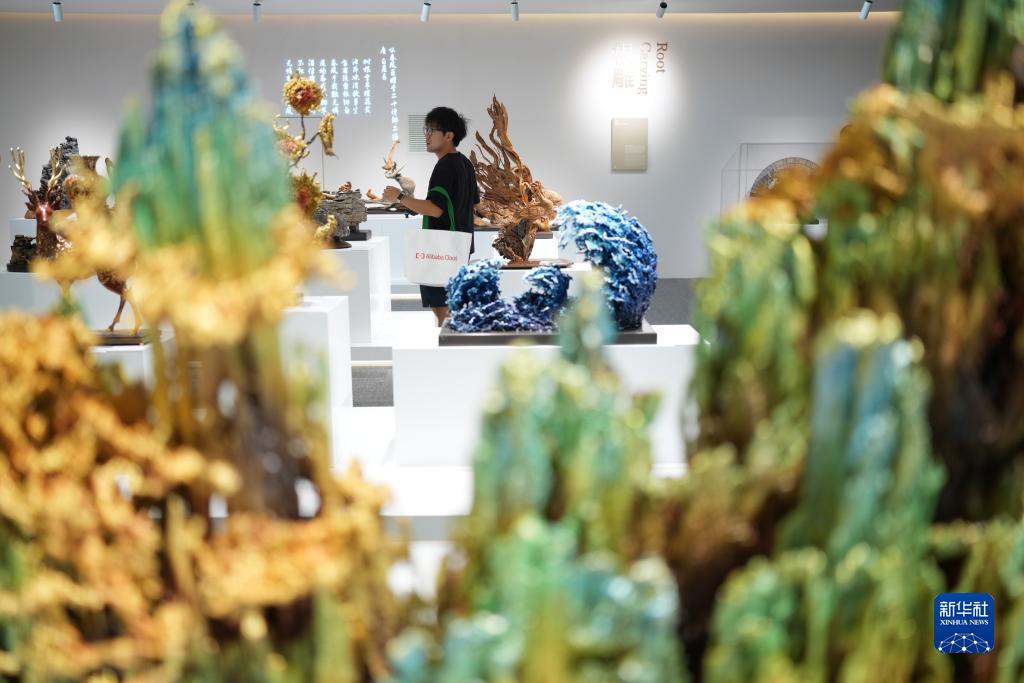 9月12日,媒体记者参观亚运村内展示的铜雕、根雕作品。新华社记者 翁忻旸 摄