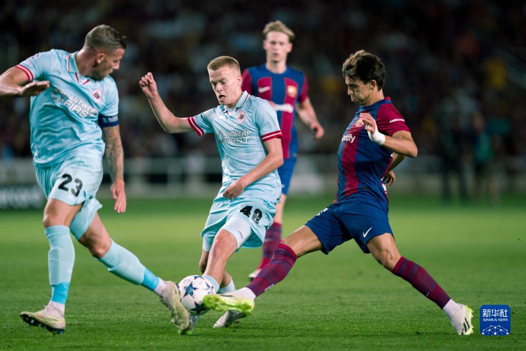 9月19日,巴塞罗那队球员菲利克斯(右)与安特卫普队球员费尔梅伦(中)在比赛中拼抢。新华社发(胡安·戈萨摄)