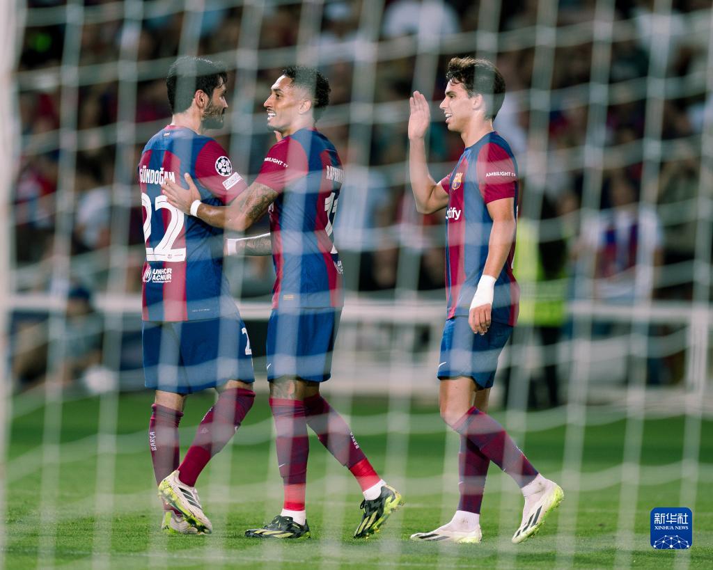 9月19日,巴塞罗那队球员菲利克斯(右)与拉菲尼亚(中)、京多安在比赛中庆祝进球。新华社发(胡安·戈萨摄)