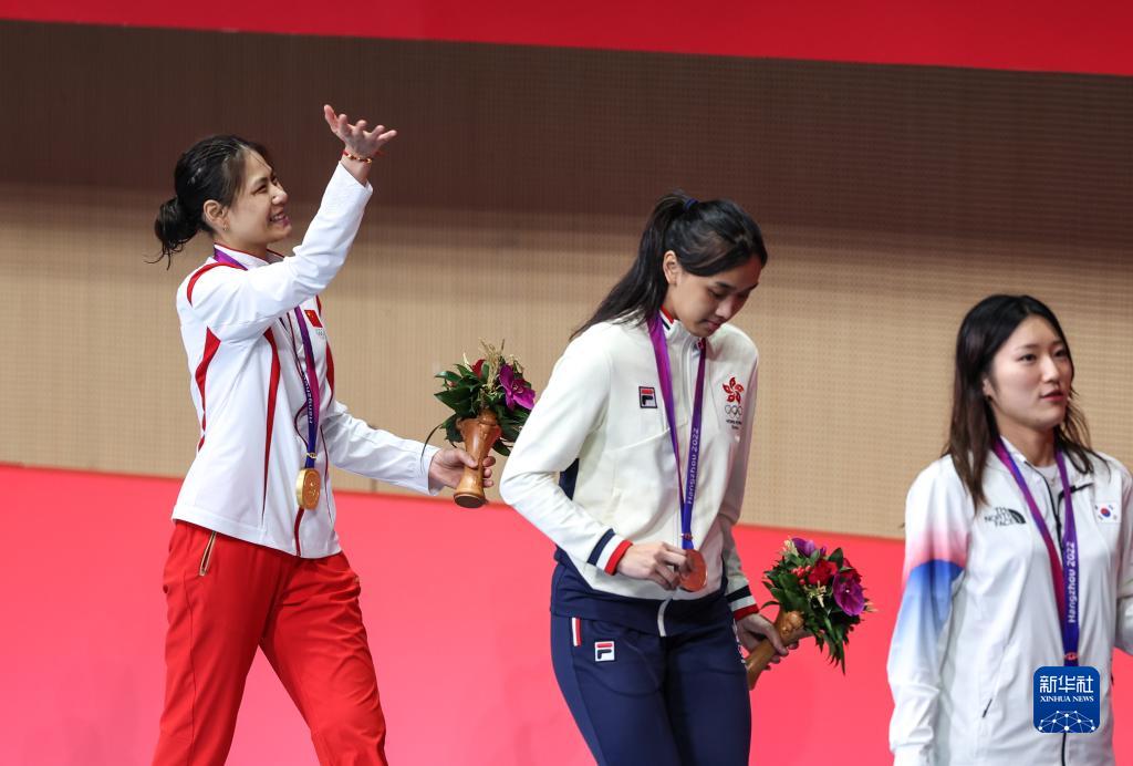 9月25日,黄芊芊(左)在领奖后向观众挥手。