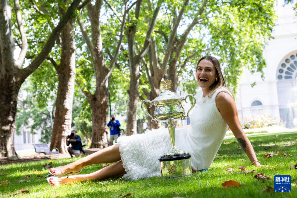 1月28日,萨巴伦卡展示奖杯。新华社发(储晨摄)