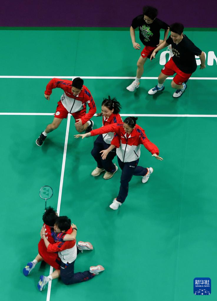 5月5日,中国队选手何冰娇(下左)在女子单打比赛获胜后与队友庆祝。何冰娇2比1战胜印度尼西亚队选手瓦多约。新华社记者 贾浩成 摄