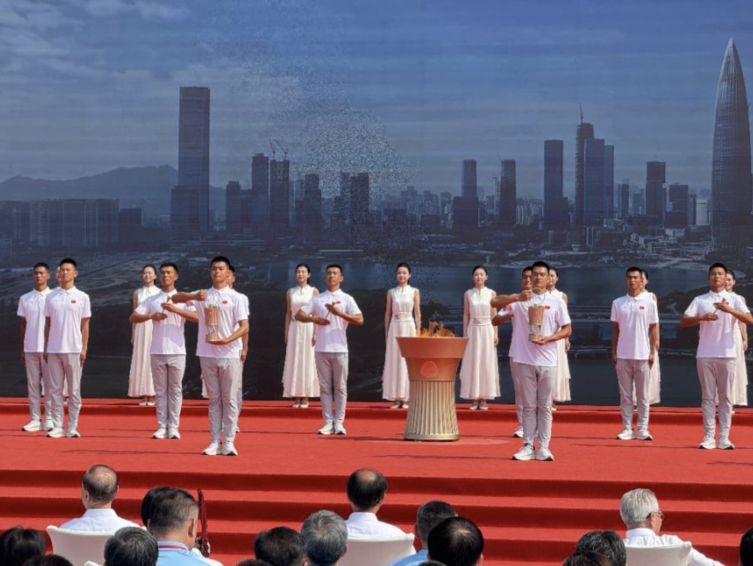 伴随着全场注视的目光,他们高举采火棒,一起点燃十五运会和残特奥会火种盆。随后,熊熊燃烧的全运圣火被引入四盏火种灯。十五运会广东赛区执委会、残特奥会广东赛区执委会、香港赛区筹委会和澳门赛区组委会代表分别受领火种。仪式结束后,火种将分别奔赴港澳广深4座城市,于11月在香港、澳门、广州、深圳四个城市举行火炬传递。