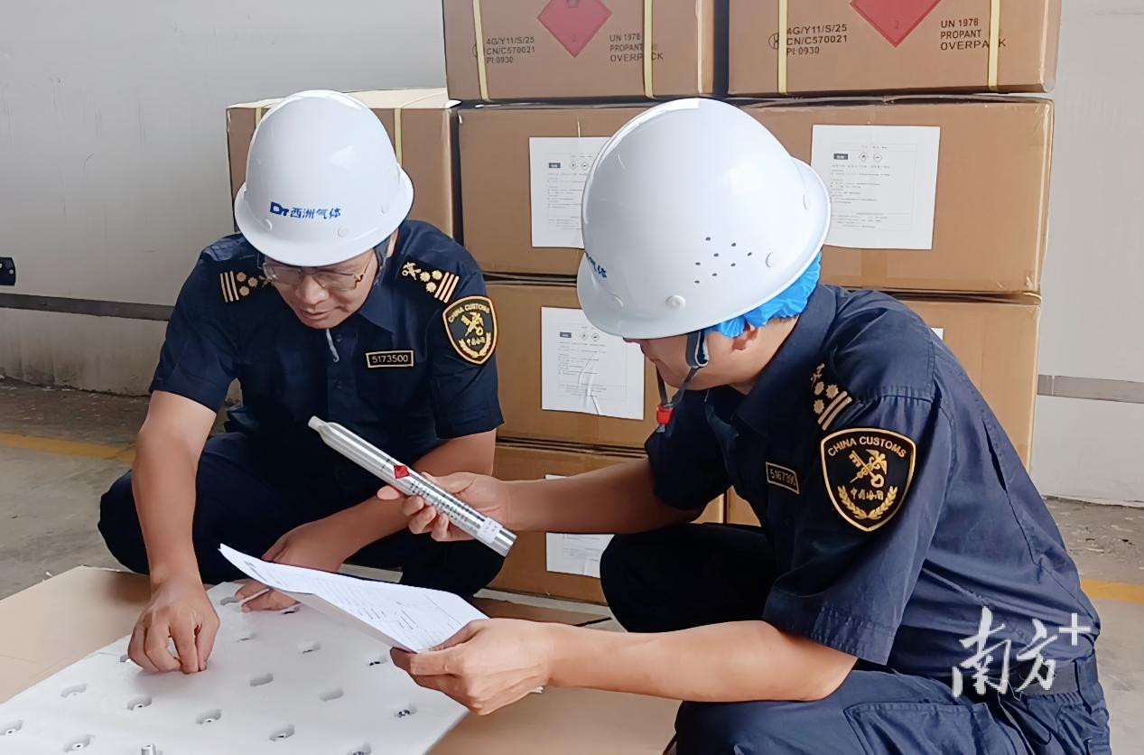 “火炬燃料瓶中所填充的丙烷是我国《危险化学品目录》(2015年版)列明的危险化学品,属于极其易燃气体和加压气体,出口前属地海关需对其实施检验监管,包括单证审核和属地现场检查。”清远海关查检科科长商春介绍,海关在到填充气体的工厂开展检查的过程中,对该批火炬燃料瓶的运输包装进行了仔细检验,指导企业使用专业缓冲材料对箱内剩余空间进行科学填充,最大限度避免运输途中因颠簸造成瓶体碰撞,保障货物运输安全。